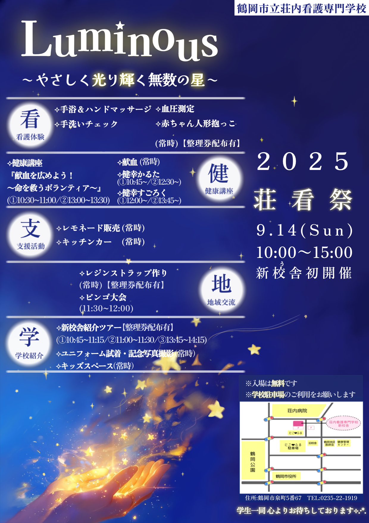 今年度のテーマは、「Luminous(ルミナス)~やさしく光り輝く無数の星~」とし、日頃の学びや看護への思いを形にし、地域の皆様と心を通わせる中で、この場がよりいっそう輝きを増す時間となるよう、心を込めて準備を進めております。